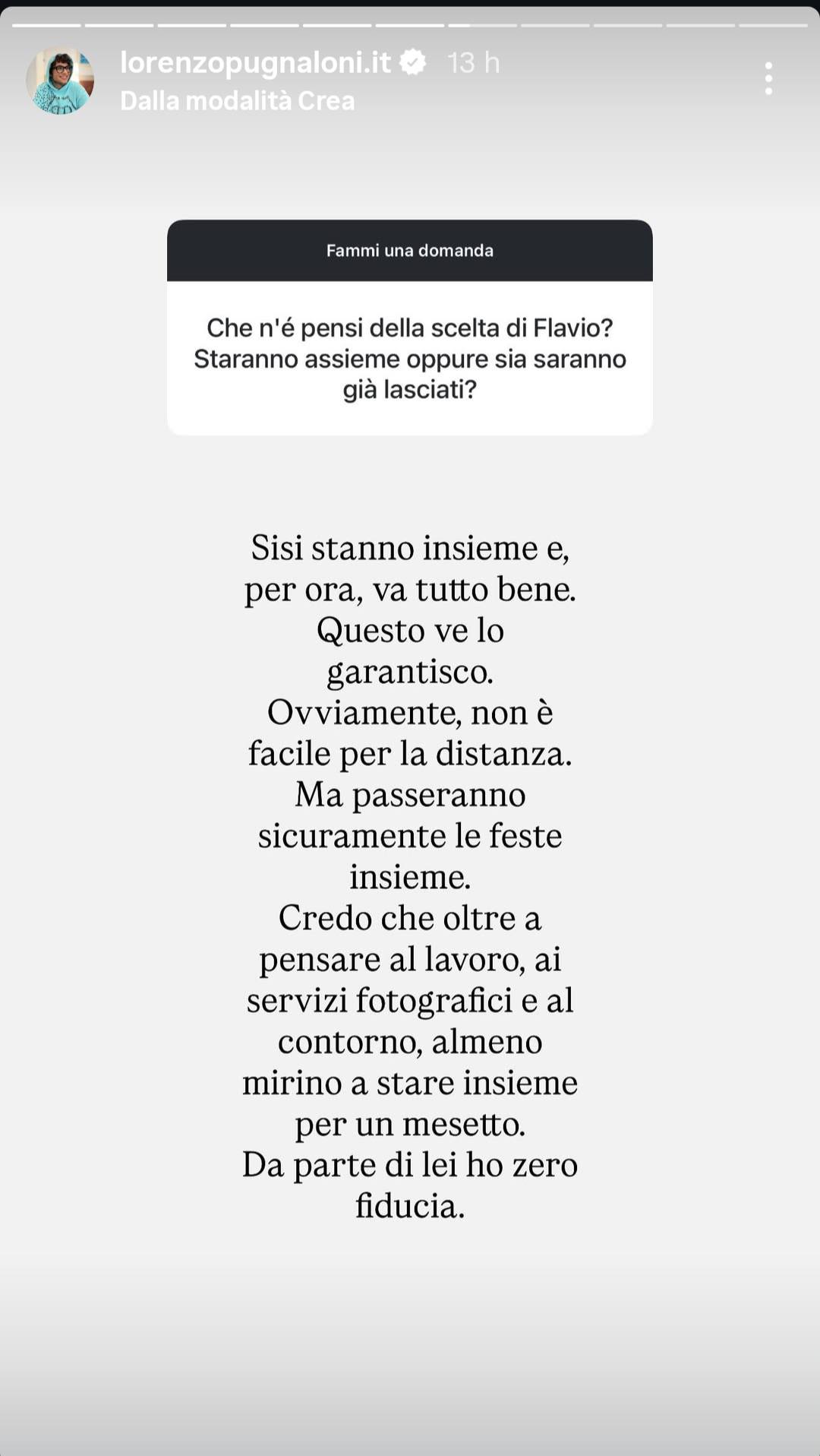 Dopo la scelta avvenuta negli studi di Uomini e Donne, Flavio Ubirti e Nicole Belloni sono diventati una coppia a tutti gli effetti. Poiché la puntata in questione non è ancora andata in onda, i due non possono rendere pubblica la loro relazione, tuttavia, mediante vie traverse, sono comunque emerse delle indiscrezioni inerenti il loro rapporto. Lorenzo Pugnaloni ha rivelato che la storia tra i due sta procedendo a gonfie vele. La voglia di stare insieme e di viversi è tanta, anche se per il momento i due devono fare i conti con la distanza, che rappresenta un impedimento.