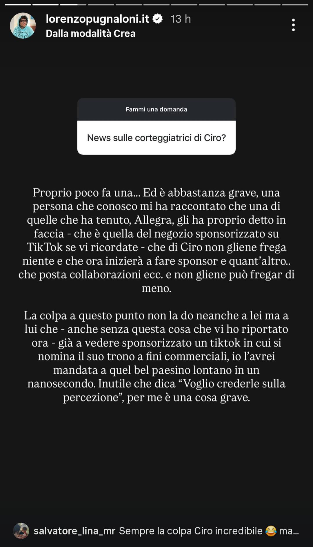 Restando su questo tema, poi, sono emerse altre rivelazioni scottanti anche su Allegra, corteggiatrice di Ciro Solimeno a Uomini e Donne. Di recente la ragazza è stata al centro dei gossip per aver sponsorizzato un negozio usufruendo della sua partecipazione a UeD. Sempre Pugnaloni ha rivelato di aver parlato con una persona, la quale gli ha detto che Allegra gli avrebbe confessato di non essere minimamente interessata al tronista, ma di avere come unico obiettivo quello di fare sponsorizzazioni. Alla luce di questo, però, viene da chiedersi se, effettivamente, la colpa non sia di Ciro che, malgrado tutte queste segnalazioni, continua a tenere lei, ma anche Alessia Antonetti, tra le sue corteggiatrici.