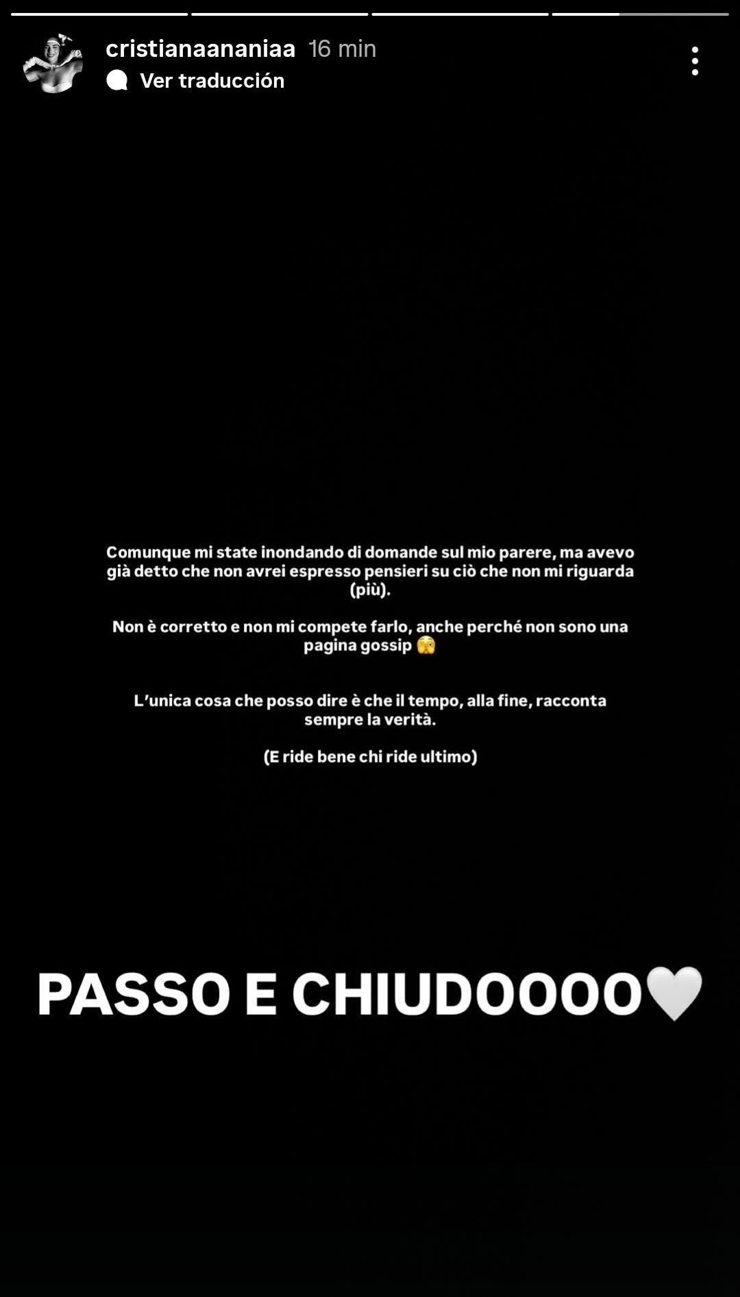 Contestualmente alle polemiche che stanno sorgendo sul web, è sopraggiunto un commento da parte di Cristiana che sta generando parecchi sospetti. L’ex tronista ha pubblicato una Storia su Instagram in cui ha detto di aver ricevuto numerosi commenti da parte di persone che le hanno chiesto di esprimere la sua opinione su una determinata questione, che tuttavia la giovane non ha voluto specificare. A seguire, poi, Cristiana ha rivelato di non voler esprimere pareri su situazioni che, ormai, non la riguardano più. Questa frase ha subito fatto pensare che la Anania si stesse riferendo alla sua precedente esperienza a Uomini e Donne. A rafforzare ulteriormente i sospetti di chi crede che la giovane abbia voluto pungere Sara Gaudenzi è stato il concetto espresso a chiusura del commento. Cristiana ha chiosato dicendo che l’unica cosa che può dire è che il tempo, alla fine, racconta sempre la verità e ride bene chi ride ultimo. Anche se il nome di Sara Gaudenzi non è mai stato fatto esplicitamente da Cristiana Anania, di riferimenti ce ne sono stati davvero parecchi, tanto è vero che in molti credono che si tratti di una sorta di vendetta della Anania contro la Gaudenzi.