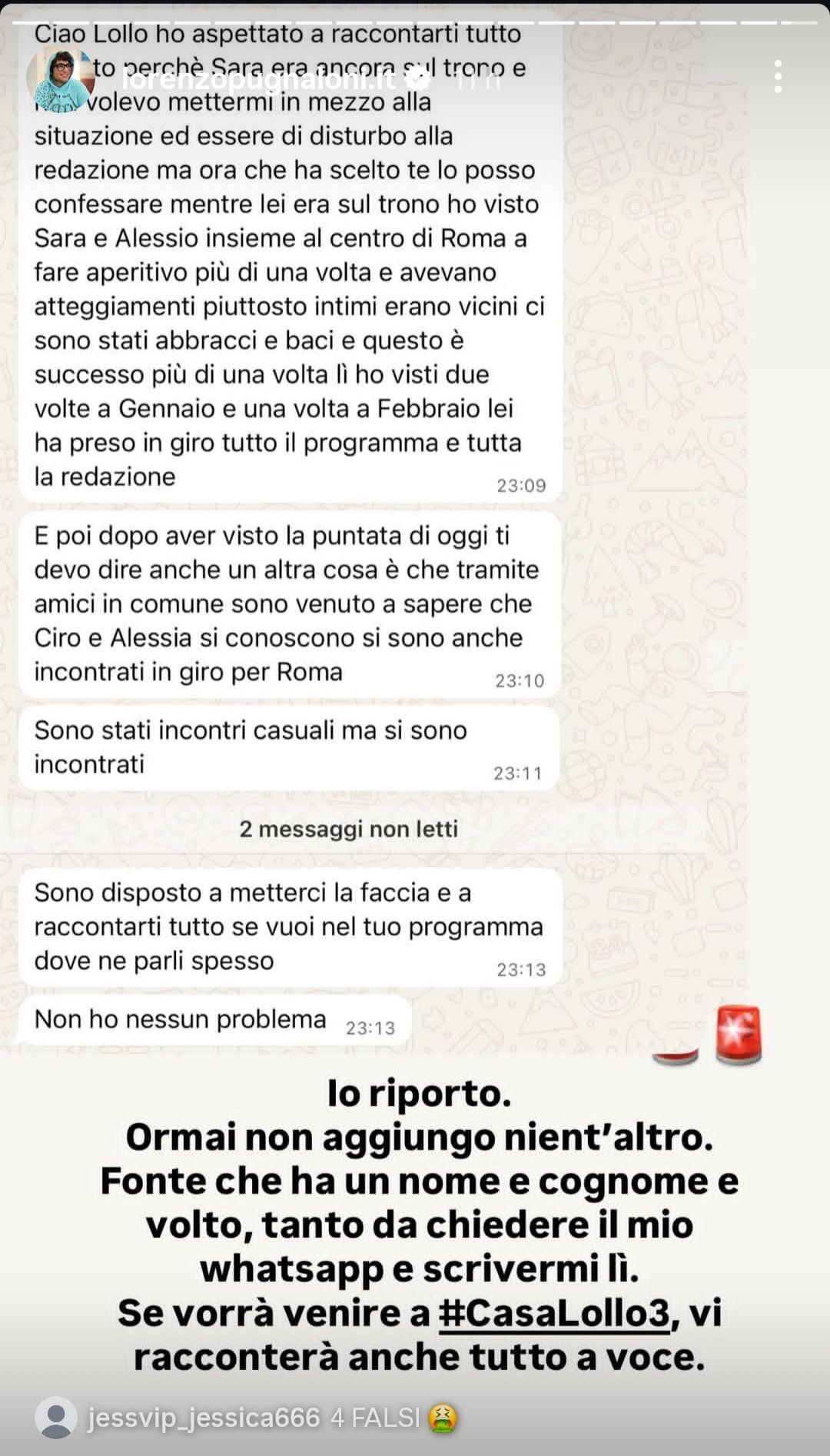 La persona in questione ha esordito dicendo di essere disposto a metterci la faccia, rilasciando anche un’intervista ufficiale per raccontare le informazioni in suo possesso. Questo sicuramente contribuisce a rafforzare considerevolmente l’attendibilità della fonte. Venendo al dunque, l’utente ha detto di aver incontrato più volte Sara e Alessio in giro per Roma mentre entrambi erano ancora nel programma. Durante questi incontri, che si sarebbero verificati tra gennaio e febbraio di quest’anno, i due sarebbero apparsi decisamente complici e in confidenza, come a dimostrare l’esistenza di un rapporto consolidato tra di loro. L’artefice della segnalazione parla addirittura di baci e abbracci che ci sarebbero stati tra i due.