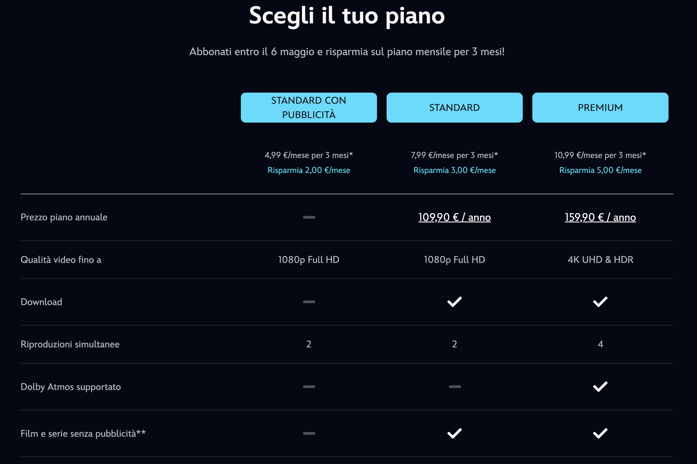 I piani disponibili con la promozione sono tre. Il piano Disney+ Premium quello con qualità 4K UHD, Dolby Atmos e fino a quattro dispositivi simultanei costa €10,99 al mese, con un risparmio di €15 nei primi tre mesi rispetto al prezzo standard di €15,99. Il piano Standard è disponibile a €7,99 al mese (risparmio di €9), mentre il piano Standard con pubblicità scende a €4,99 al mese, con un risparmio di €6. L’offerta è accessibile esclusivamente tramite il sito ufficiale di Disney+ e, al termine dei tre mesi promozionali, il rinnovo avviene automaticamente alle tariffe standard, salvo cancellazione che si può effettuare in qualsiasi momento, senza penali o costi aggiuntivi.